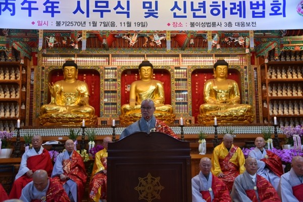 원로회의 의장 호명 스님은 신년사에서 “2025년은 우리 태고종도 여러 성과를 쌓아올린 뜻깊은 한 해였다”면서 “광화문 국제수계대법회와 영산재 시연, 중국불교계와의 교류, 종조 태고보우국사 위상 재정립 사업 등은 종단의 뿌리와 미래를 동시에 다지는 소중한 결실이었다”고 강조했다. 호명 스님은 이어 “새해에도 모든 종도들이 종단을 중심으로 화합과 신뢰의 공동체를 더욱 견고히 만들어가자”고 당부했다.