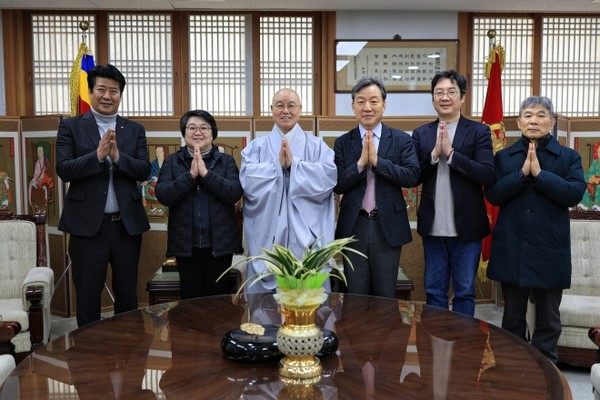 한국불교태고종 총무원장 상진 스님은 2월 10일 오전 11시 한국불교전통문화전승관 2층 총무원장 집무실에서 한국교수불자연합회(이하 교불련) 이상훈 회장(대전대 교수)을 비롯한 임원진의 예방을 받고 환담했다.