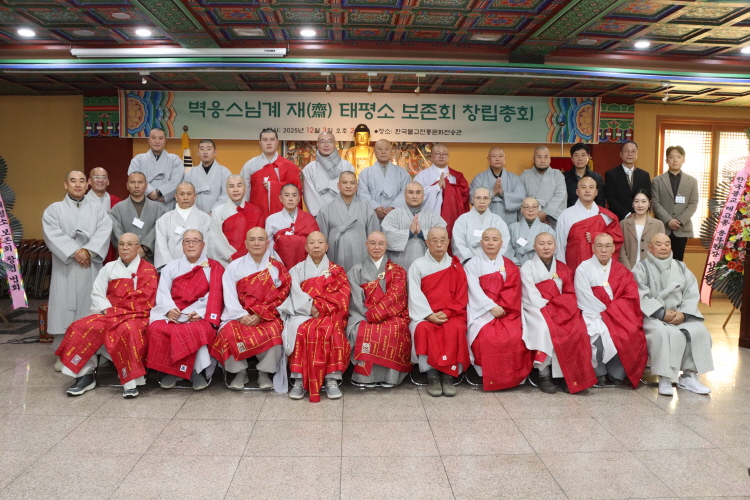 12월 3일 오후 2시 총무원장 상진 스님은 한국불교전통문화전승관 1층 회의실에서 총무원 부설 ‘벽응 스님계 재(齋) 태평소보존회 창립총회를 개최했다. 이날 창립총회에는 총무원장 상진 스님을 비롯해 태평소보존회 초대회장으로 선출된 불교문예원장 지허 스님, 영산재 전승 교육사 일운 스님, 영산재보존회장 현성 스님, 교육원장 재홍 스님 등과 보존회원 스님 등이 참석했다. 보존회장 지허 스님은 “1993년 신촌 봉원사에서 호적(胡笛, 태평소) 특강이 열렸고, 벽응 스님에게 가르침을 받았다. 당시 스님께서는 ‘자네만 알지 말고 후학들에게 반드시 전하라’고 말씀하셨고 이를 잊은 바 없다”면서 “그럼에도 벽응 스님의 소중한 불교 가락이 사라질 위기여서 안타까웠는데 보존회가 발족하게 돼 감개무량하다”고 소감을 전했다.