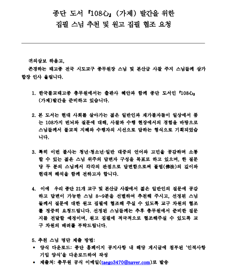 종단 도서『108心』(가제) 발간을 위한 집필 스님 추천 및 원고 집필 협조 요청 한국불교태고종 0 5시간전 2026.02.27 13:09 명단취합양식종단도서 집필스님명단_108心.xlsx (11.1K) + 0