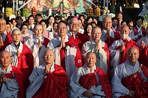 봉원사 대중 스님들이 삼천불전 앞에 마련된 특설무대에서 인등기도법회를 집전하고 있다.한국불교태고종 서울 신촌 봉원사(주지 현성…